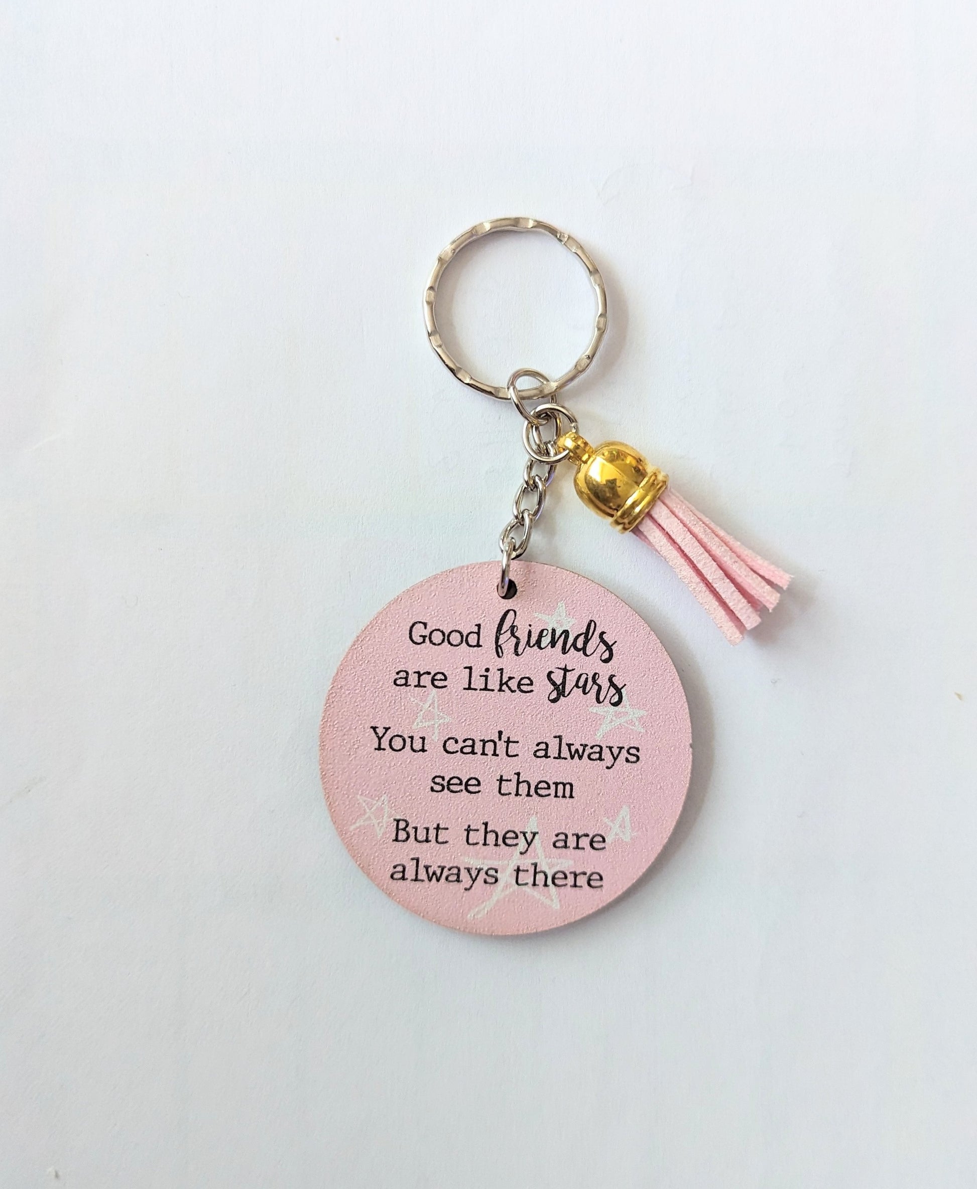 UV printed Good friends keyring, with tassel, printed onto 3mm thick mdf wood. The back of the keyring is left blank.